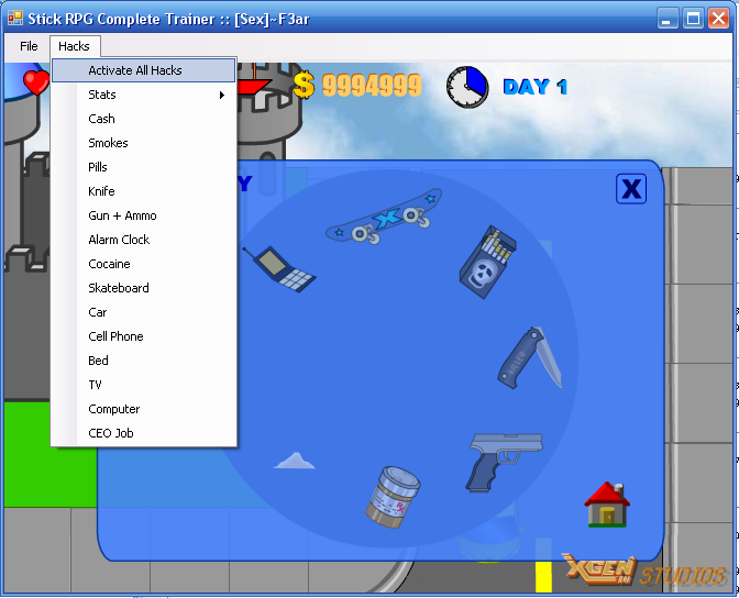 Hacks: Health, Karma, Money, CEO Job, Car, Gun + Ammo, Charm, Intelligence, Computer, TV, Bed, Cellphone, Skateboard, Cocaine, Alarm Clock, Knife, and Pills.
